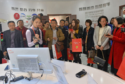 上图:比硕讲解员向人民网、中新网等特邀媒体记者和现场嘉宾,介绍公司城市静态交通系统及停车APP。(朱宇 摄)