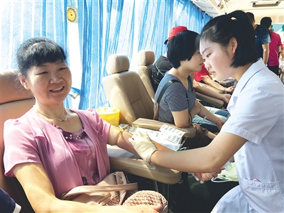 献血车上,在市移民局工作的李景华满头大汗,原来为了赶上献血时间,他特意小跑了一段路,而他也是献血“老常客”,已捐献了十余次的血液。“平时经常主持献血活动,这次我也来当当献血志愿者。”市南词剧团职工熊军告诉记者,他经常主持献血宣传活动,献血是项公益事业,可以帮助他人,他这次是“现身说法”,用献血的方式表达自己的爱心。
