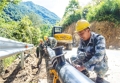 政和县岭腰乡集镇供水工程是该乡实施的一项民心工程,总投资550万元,日供水规模1800立方米,预计9月底完工。项目建成后,可解决岭腰乡近万人的饮水问题。图为18日上午,施工人员在岭腰乡高山村立新段铺设输水主管道。