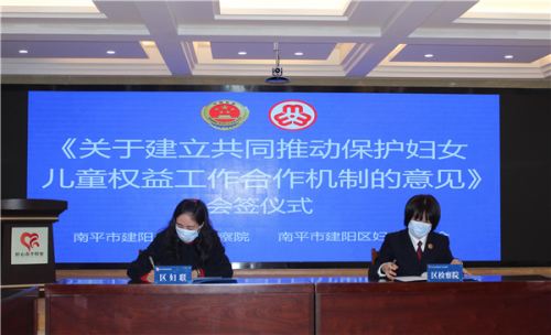 福建法治报-海峡法治在线2月7日讯 近日,南平市建阳区检察院与区妇女联合会启动“潭馨·护蕾”检妇关爱女童项目,双方单位负责妇女、儿童权益保护工作的领导同志参加启动仪式。图为双方会签《关于建立共同推动保护妇女儿童权益工作合作机制的若干意见》。(蔡艳敏 摄)