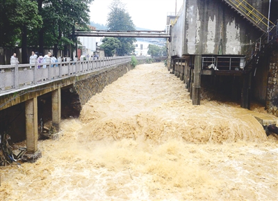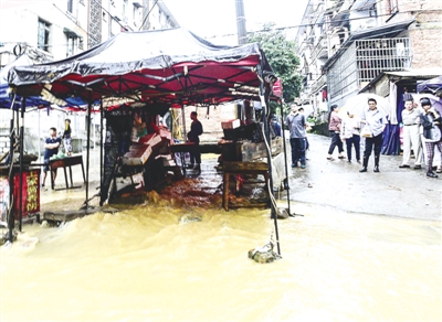 昨日,一整天的暴雨,南纺厂旁的内河洪水凶猛冲下(如图①),南纺往南针方向路面积水较深。图②为南针厂一路边店被洪水围困的现场。