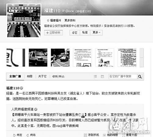 昨日上午10时许,福建省公安厅指挥情报中心也在其腾讯官方微博“福建110”上发布信息,称经查,是一名江西男子因感情经济纠纷,将其女友推下站台,致女友被驶来的火车轧断双腿,送医院抢救无效死亡,犯罪嫌疑人则已投案自首。