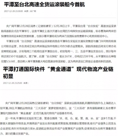 28日晚18点30分,东南卫视新闻栏目《福建卫视新闻》头条播发了《平潭:打通国际快件“黄金通道”》!不仅如此,还有数十家媒体以《平潭至台湾“台北快轮”高速货运滚装航线首航》、《平潭打通现代物流快件“黄金通道”》等为题进行了集中关注报道,部分稿件内容整理好了,我们一起往下看。