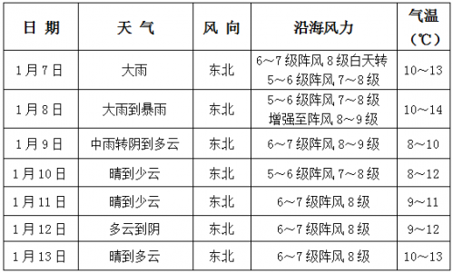 具体报告:6-7日我省中南部地区有暴雨,局部大暴雨。8日起受强冷空气影响,中北部地区雨转雪,全省气温大幅下降,我省将出现较大范围的寒潮天气过程,过程降温幅度9~14℃,最低气温出现在11日前后。西北部地区-6~-3℃,中南部沿海地区4~7℃,其余地区-2~3℃。9~13日全省大部有霜或霜冻,中北部地区有结冰。下周沿海风力持续较大,有7~9级东北大风。