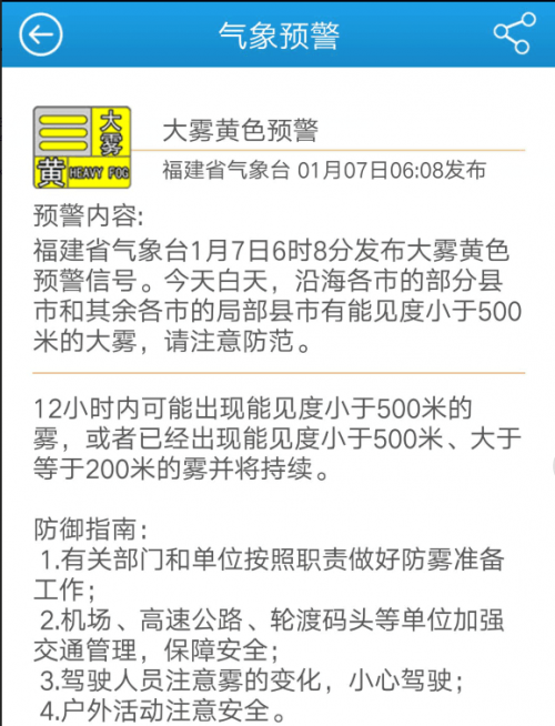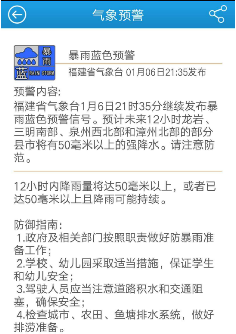 据省气象局天气预警报告,受冷空气影响,全省气温将大幅下降。省气象局5日发布“福建省暴雨警报”和“暴雨预警Ⅳ级”,6日21时35分继续发布“暴雨蓝色预警”,今日6时许发布“大雾黄色预警”。