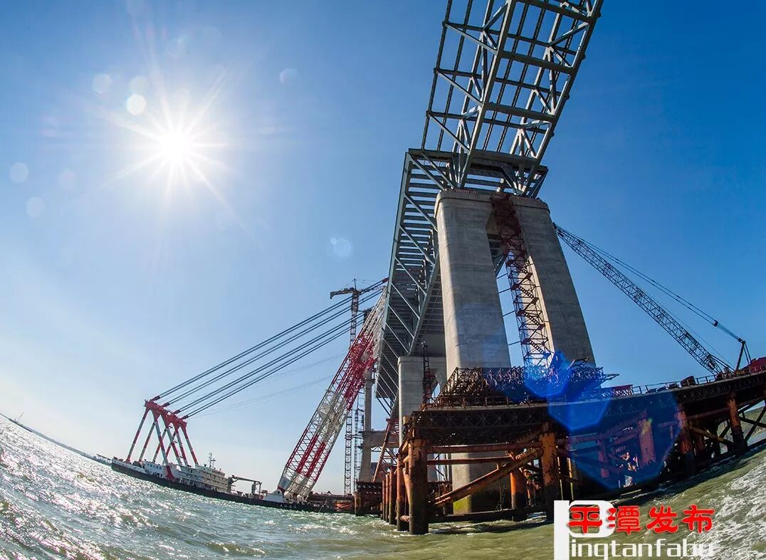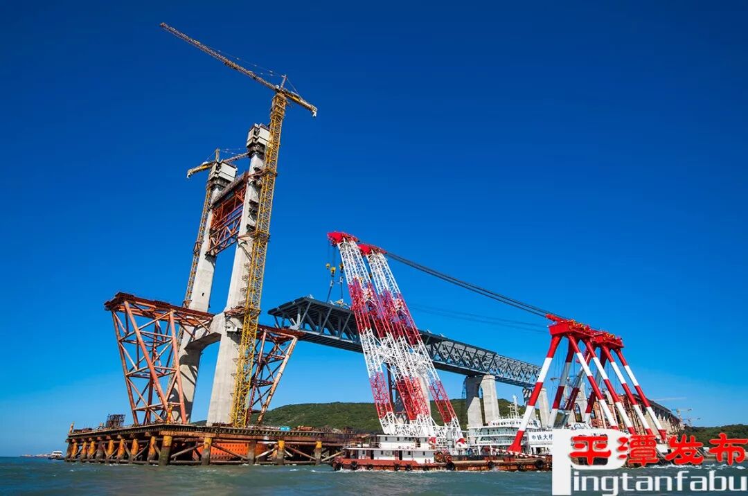 据福平铁路三标段三分部项目副总工刘宏达介绍,此次架设的钢桁梁重量为3324吨,需要到达的高度为103米。同时吊起这样重量和高度的钢桁梁,国内只有“大桥海鸥”能够做到,同时,它还能够最大程度适应平潭海域恶劣的环境。因此,进入梁部施工以来,“大桥海鸥”起重船成为钢桁梁整体架设的不二选择。