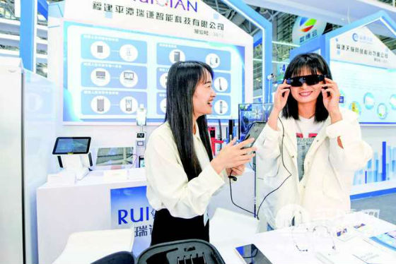 参观者体验福建平潭瑞谦智能科技有限公司研发的智能识别眼镜