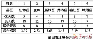 根据莆田市环境监测中心站监测数据,2017年5月份上半月(5月1日-5月15日)环境空气质量按优天数、良天数、综合指数总体考核,排名如下表: