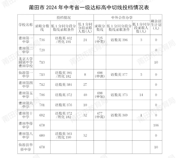 莆田市2024年中考省一级达标高中切线投档情况