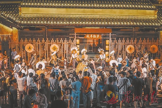 8月8日,夜幕降临,湄洲岛妈祖影视城内,一串串红灯笼亮了起来。19时许,永宁台前响起了欢快的乐曲声,“台湾欢年”表演开始。这是《缘起湄洲》8个点位表演之一。只见身着台湾高山族传统服饰的演员,手牵手跳起舞来,展现“丰年祭”习俗,不少游客获邀加入一起体验(如图)。