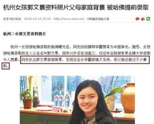 我相信她是个诚实的孩子,但媒体选择性忽视她的背景信息,将她考上哈佛的事情描述成是一个“灰姑娘的故事”,不仅违背了事实,而且一旦她的背景被曝光,恐怕更会令这位女生无端背上了媒体给她制造的 “装-哔-”的锅。
