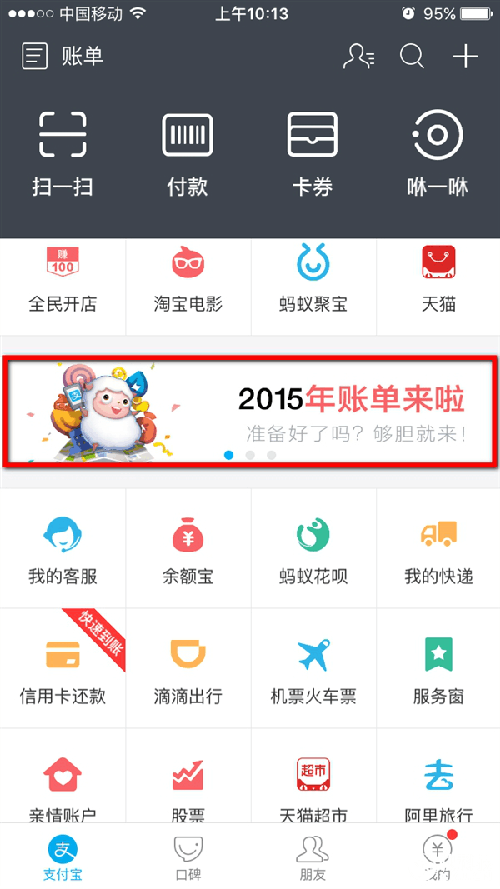 昨天的全民账单【全民账单城市排名榜单】只是预热,重磅的来了,“我的花样生活”——2015年度支付宝个人账单已经出炉。现在,只要更新到最新的v9.5.1版本,就能看到2015年账单了。