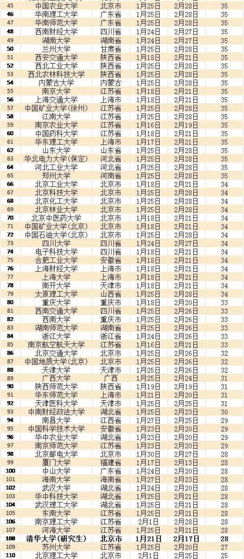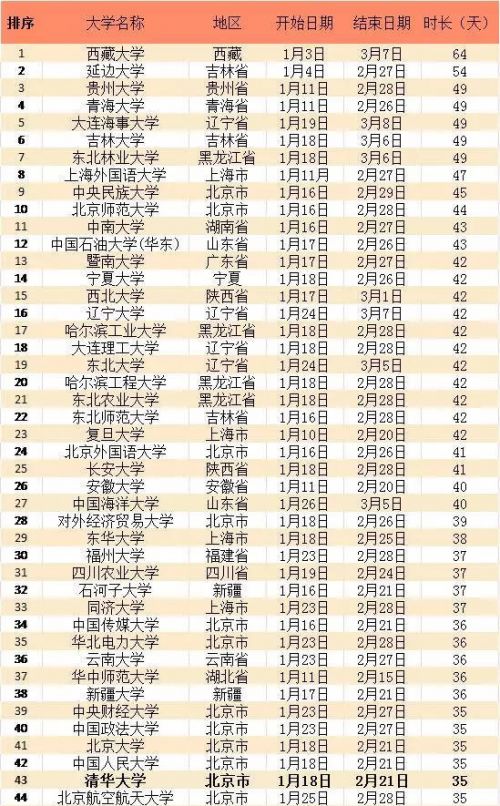 2016国内高校寒假放假/春节开学时间表 放假天数一览
