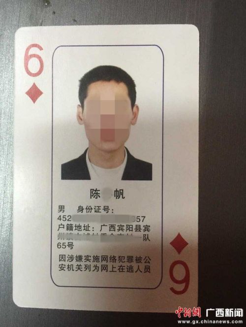 涉案的陈某东躲西藏,辖区派出所组织多次抓捕,因一时难以找到其落脚信息,致使其一直没有归案。宾阳警方展开网络犯罪专项行动后,将其随机印刷成扑克牌上的“方块6”进行全民追捕。