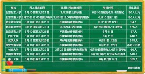 2016年的高考安排在6月7日、8日两天进行,高考后的第一个周末是6月11日、12日。11所高校中,北京师范大学、武汉大学、 西安交通大学、中山大学都把考核时间安排在6月11日、12日两天;北京化工大学、北京邮电大学和长安大学,则是6月10日报到,次日考核;北京交通大学 6月10日、11日测试;中国传媒大学6月11日笔试,面试则安排在6月12日至14日。