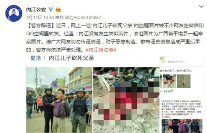 3月10日,“内江儿子砍死父亲”的消息经一名网名为“夏洛”的网友发布,在QQ空间和微信朋友圈吸引了众多网友评论和转发,一度在网上造成了巨大影响。3月11日,内江市公安局 发现了该则消息。“当时我们就在问这个事情到底是不是真的,就根据上面的图片搜索,发现在3月10日,在广西平南县公安局官方微博上发布了一则消 息,上面配图与该内江网友发布的消息配图是一模一样的。我们就已经意识到,该网友发布的消息是谣言。”内江公安官方微博管理员说。