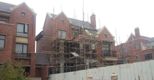 上海青浦区富力桃园102号别墅重建工地,工地竖起一个5层楼高的井架。