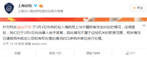 上海边检3月17日消息针对网友@pp不休于3月4日反映的在入境航班上与外籍旅客发生纠纷的情况,经调查后,我们已于3月6日向当事人给予答复,因此情况不属于边检机关的职责范围,相关情况已通报相关航空公司和有权处理此情况的口岸相关单位进行处理。