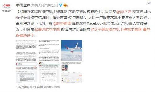 @中国之声:【网曝乘客维珍航空机上被辱骂 求助空乘反被威胁】近日网友@pp不休发文称自己乘坐维珍航空航班时,遭乘客辱骂“中国猪”。之后一空服要求她不要与骂人者吵架,否则将赶她下飞机。据@航空物语 维珍航空Facebook账号表示已与投诉人直接联系,但目前@维珍航空中国微博未对此事回应。
