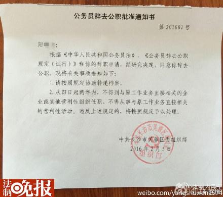 今年2月5日,湖南省长沙市芙蓉区委组织部批准其辞去公职。