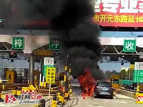 小车过高速收费站突发自燃 整车被大火吞噬(图)