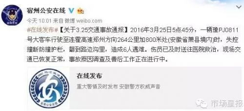 今天上午@宿州公安在线 发布消息称: 3月25日5点45分,一辆豫PJ0811号大客车行驶至连霍高速郑州方向264公里加800米处(安徽省萧县境内)时,失控撞断防撞护栏,翻到路边沟里,造成6人遇难。