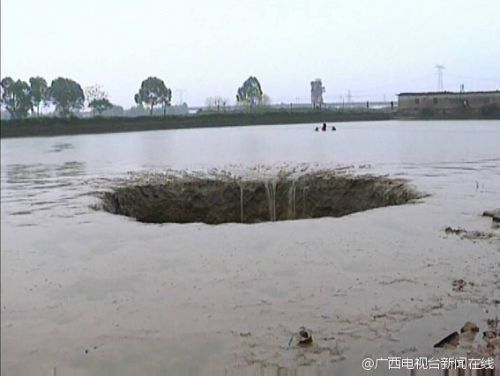 广西鱼塘惊现大坑 村民推测与附近采石场有关(图)