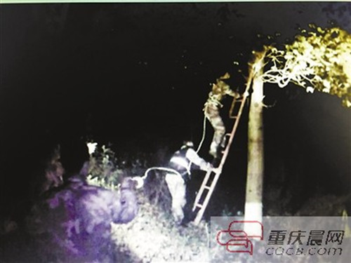 消防官兵将无人机从树上取下。上游新闻记者 雷键 翻拍