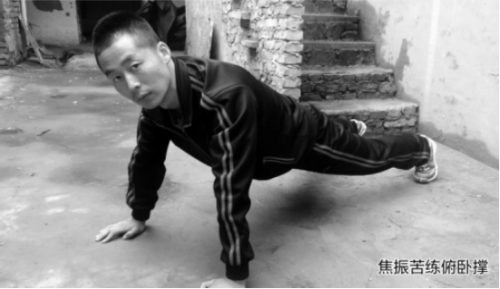 15岁时,焦振在父亲指导下练习俯卧撑,“刚开始练一次也就能撑十来个、二十个,渐渐越来越多,后来能撑到三四十个、七八十个。”