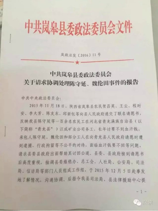 在这份落款日期为“2016年5月6日”的公函中,岚皋县政法委简要讲述了来函原因: