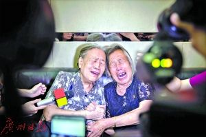 ↑满头银发的姐姐艾淑章(左)和妹妹李淑荣执手痛哭。记者 陈忧子 摄