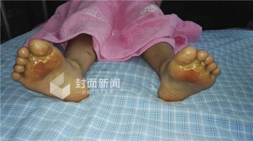 37摄氏度高温下,小学生被罚光脚跑,致脚掌红肿溃烂,有水泡,有黄色液体流出。