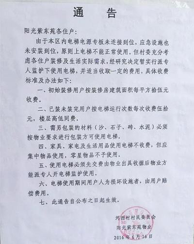 所以,才出台了这个电梯付费使用的通告。冯先生称,村里的本意并不是想收钱,只是想用这个通告挡住那些想用电梯的人,“因为现在电梯的电源专板还没连接到位,原则上是不能使用的。”