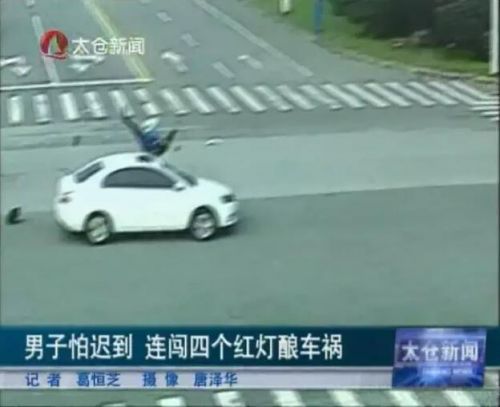 最近,太仓港区的一名贺姓男子担心上班迟到,开车加足马力、连续闯红灯,在闯第四个红灯的时候引发了车祸。