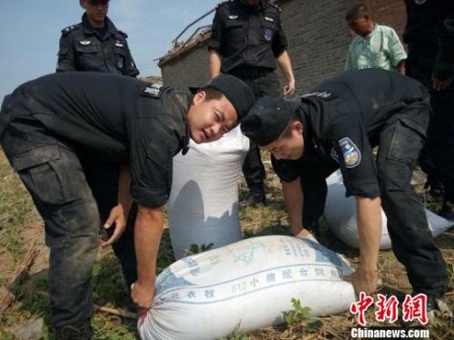 孙青伟和队员帮助受灾群众抬粮食。 警方供图。 摄