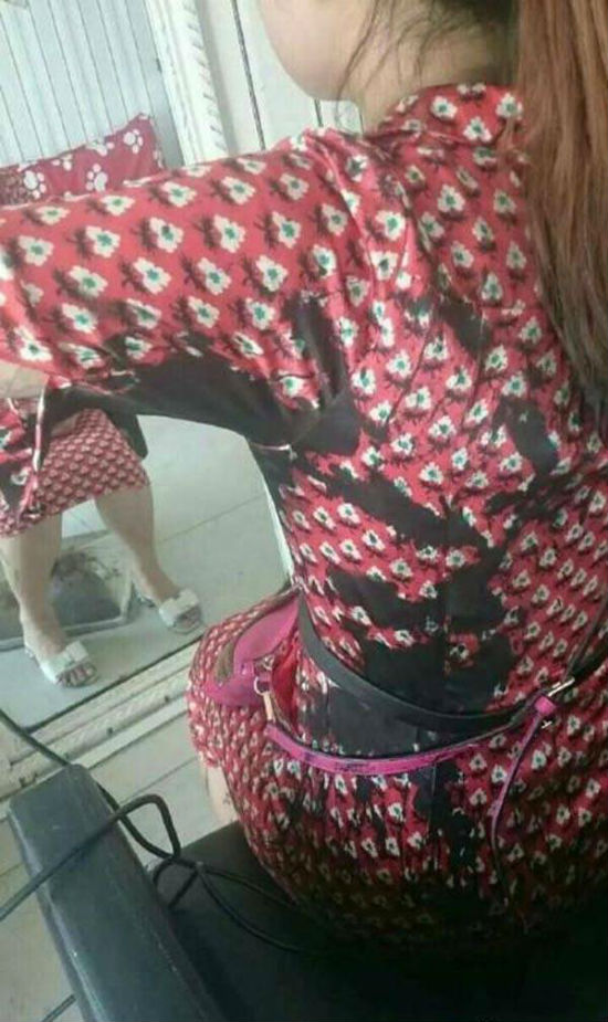多张网传照片显示,一名身穿红色裙子的女子脸部、颈部、裙子等均被黑色液体浸染。