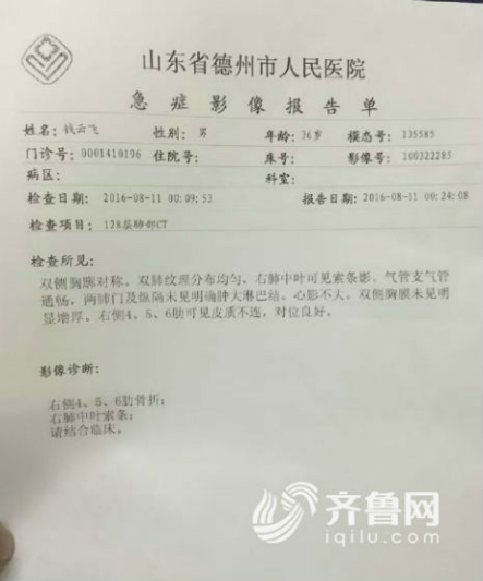 根据德州市人民医院2016年8月11日凌晨0点09分的《急诊影像报告单》,检查结果为“右侧4、5、6肋骨折”。