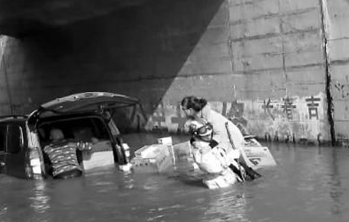 女司机将油门当刹车 冲进臭水坑一车药物泡汤