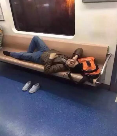 近日,一位北京网友贴出了朋友圈的几张图。图中显示,一位乘坐地铁的小伙看到一名男子脱鞋横躺在地铁座椅上。