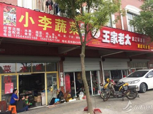 图为位于闵行区浦江镇昌林路430号的“王家老太镇江锅盖面”和“小李蔬菜”店门口。