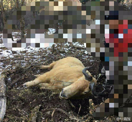 【野生羚牛被铁丝勒死 】11月13日,西安市民米女士与朋友一起到秦岭爬山。上午10时许,当她们走到天华山保护区西段附近时,发现一头被人下套勒死的羚牛。