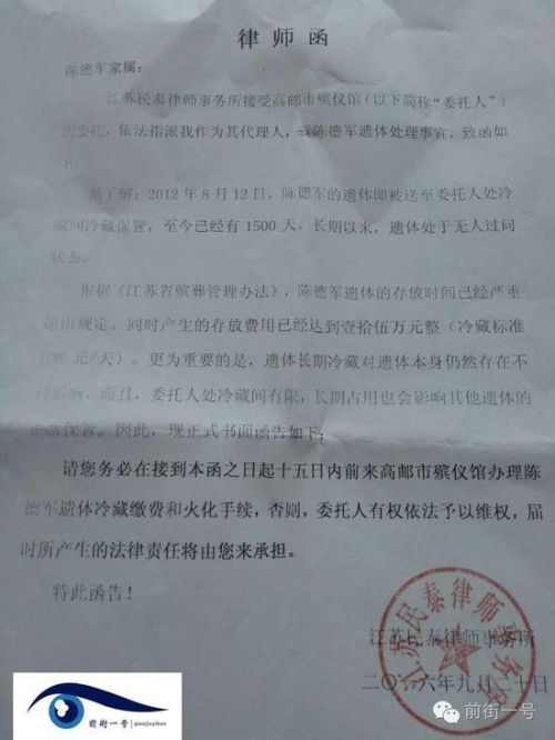 该封律师函称,自2012年8月12日陈德军的遗体被送至殡仪馆冷藏,至今已有1500天。因存放时间已经严重超期,按照每天100元计算,存放费用已达15万元,故要求周晓静接函之日起15日内到高邮市殡仪馆交纳冷藏交费并办理火化手续,否则,所产生的法律责任将由周晓静承担。