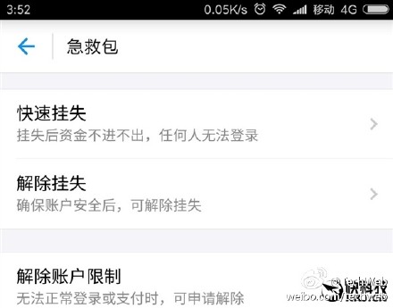 目前支付宝还未对此进行回应,如果突然收到支付宝发来的验证码短信,提示有人尝试登录你的支付宝账号,大家可以立刻进入支付宝客户端,点击【我的】→【设置】→【安全中心】→【急救包】→【快速挂失】。