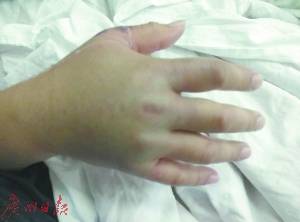 没想到,事发后第二天,朱俊杰开始发烧,右手手部明显肿胀,朱婷婷便匆匆带着爸爸到广东省人民医院。“在等待门诊叫号过程中,爸爸开始全身发冷、呕吐、眩晕并陷入半昏迷,马上就被抬进抢救室,经抢救苏醒过来后,右手持续肿胀、异常发黑,还伴有剧痛。”朱婷婷说,病情突然恶化让自己意识到问题可能有些严重。