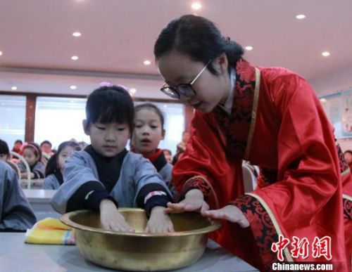 国学老师教孩子们以“金盆”洗手,取“净手静心”之意。 周素 摄
