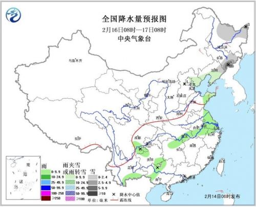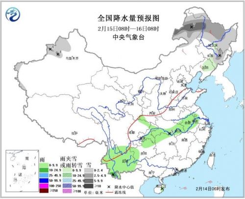 图1 全国降水量预报图(14日08时-15日08时)