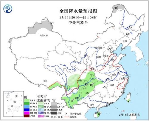 14日08时至15日08时,北疆北部、川西高原中部等地有小雪或雨夹雪,局地中雪;西南地区东部和南部、西藏东南部、海南东部等地有小雨或阵雨。内蒙古中东部有4-5级风。(图1)。