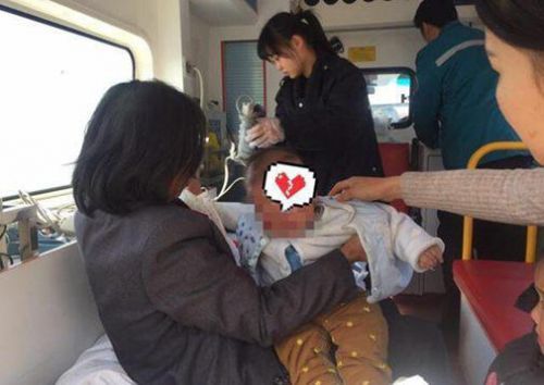 幸亏冬天衣被包裹得多,婴儿面部有大面积淤青暂无生命危险,10:42分,救护到现场接走伤员。