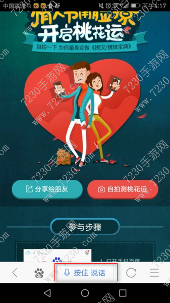 2、进入百度APP首页,按住说话,输入语音开启桃花运。