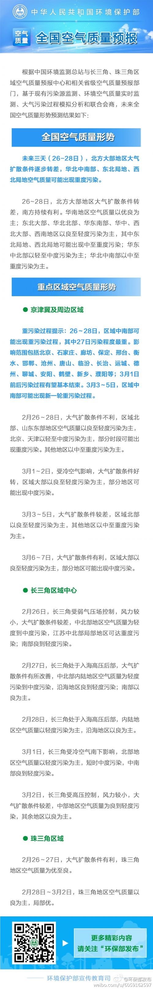 中新网2月25日电 环境保护部宣传教育司官方微博今日下午发布全国空气质量预报。预报称,26-28日华北中南部、东北局地、西北局地可能出现空气重度污染。京津冀及周边地区中南部27日污染程度最重,3月1日污染过程有望结束,3月3-5日,可能出现新一轮重污染过程。